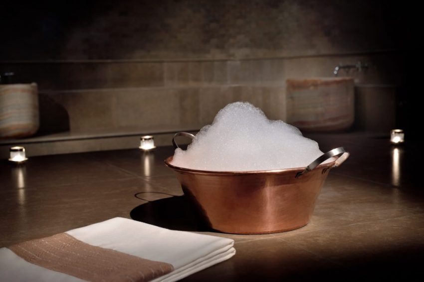 تستمر تجربة الحمّام لمدة 90 دقيقة وهي مليئة بالعطور المنعشة، وتبدأ بجلسة تقشير البشرة بقفازات الكيسا وترطيب البشرة بالصابون القشتالي التركي.