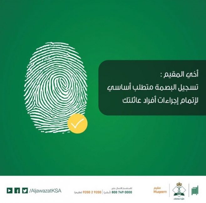 وفى نفس السياق دعت وزارة الداخلية من خلال المديرية العامة للجوازات في المملكة جميع المقيمين المغتربين في المملكة العربية السعودية الذين لم يسجلوا بصماتهم (الخصائص الحيوية) إلى سرعة التوجه إدارات الجوازات ومراجعة تسجيل البصمة الخاصة بهم في النظام الآلي لهم ومرافقيهم.