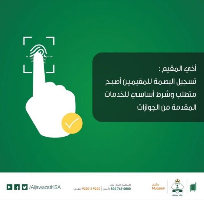 نشرت الهيئة العامة للجوازات في المملكة العربية السعودية بيان لها تدعو فيه كافة المقيمين المغتربين في جميع أرجاء المملكة لتسجيل البصمة الخاصة بهم وفقا لموقع موسوعة المسافر.