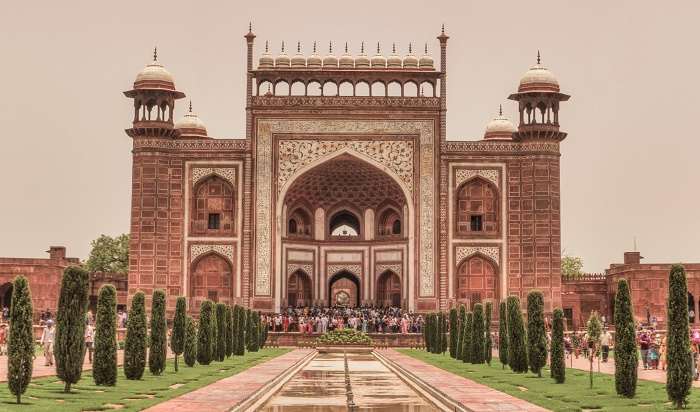 Every element of the Taj complex was designed to uphold the majesty and beauty of the Taj Mahal. The main entrance gateway or Darwaza-e-Rauza is constructed with red sandstone and is designed in such a way that standing outside the archway one cannot see the Taj, but upon entering it manifests offering a breathtaking effect.