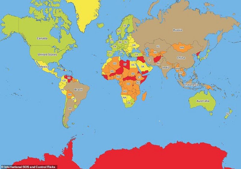 وأكد التقرير أن الدول التي يتم وضعها باللون الأحمر فهي دول شديدة الخطورة وينبغي عدم السفر إليها بشكل نهائي.