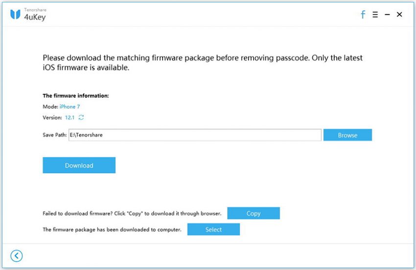 الخطوة الرابعة : قبل إلغاء القفل يجب القيام بتنزيل أحدث حزمة نظام تشغيل ios على الإنترنت، وإذا حدث فشل في تحميل حزمة البرامج الثابتة، يجب النقر فوق “copy” لتنزيلها من خلال المتصفح، وفي حالة تنزيل حزمة البرامج الثابتة يتم النقر فوق “browse” لإضافة البرامج الثابتة.