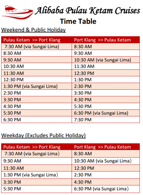 لذا إذا أردت التوجه إلى جزيرة كيتام، يمكنك شراء التذاكر من على المنضدة في رصيف المراكب الصغيرة أو على متن العبّارة، ولكن عليك أن تعلم أن أخر عبارة تغادر ميناء كلانج في تمام الـ 5:30 هذا في أيام الأسبوع، بينما في العطلات يستمر العمل لـ 6:30.