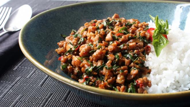 وهو طبق الدجاج المطبوخ مع الكثير من الريحان والثوم والفلفل الحار يتم تقديمه فوق وعاء من الأرز الأبيض، ويقدم مع بيض مقلي، ولكن احذر هناك نوع آخر من هذا الطبق، أي يحمل الاسم نفسه ولكنه مصنوع من لحم الخنزير المفروم.