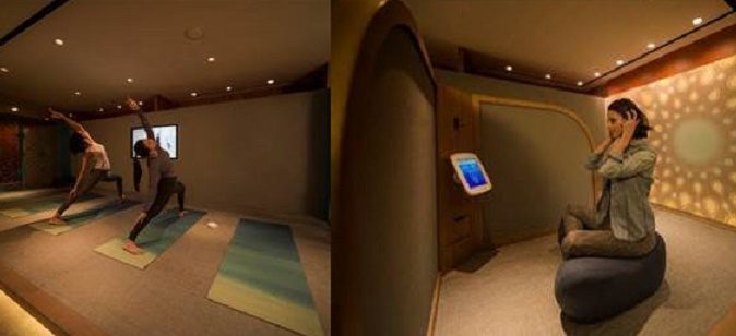 | ذا مايند سَنكتشوري لممارسة التأمل والتركيز | يوفر نوعين من التأمل:النوع الأول: التأمل باستخدام التأثيرات الصوتية مع أربعة حجراتٍ مزودة بوسائدٍ وثيرة وسماعات عازلة للضجيج وجهاز آي باد يمكّن العملاء من الاستماع إلى التعليمات الخاصة بجلسات التأمل بصوت معلمي بيور يوجا الخبراء.