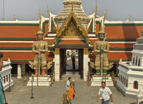 3- استمتع بمشاهدة التمثالين الضخمين، القائمين أمام المعبد، بالقصر الكبير في بانكوك ،والذي تم نحتهما وتصنيعهما في الصين، واهدائهما لشعب تايلاند.