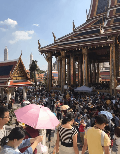 2- تنصحك الرحالة ، بالذهاب مبكرًا، فالمكان يعج بعشرات الآلاف من الزوار يوميًا، من كل الأجناس والأعراق، ينتظرون دورهم، للدخول الى القصر الكبير في بانكوك.