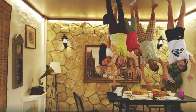تعد زيارة هذا المنزل متعة حقيقية لرواده، فكل أثاثه مقلوب ومثبت في السقف بعناية فائقة، ليظهر لمن يشاهده كأن كل شيء مقلوب.