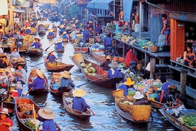 3- الرحلة المشهوره قوي برضه: رحلة السوق العائم في بانكوك (ويبعد عن بانكوك حوالي ساعة ونصف وده بتمشي بيه في مركب وسط النهر وبتتعرف على طبائع وعادات وتقاليد السكان المحليين وبتشوفهم وهم بيبعوا بضاعتهم سواء كانت من الفواكه الاستوائية أو الملابس والمشغولات اليدوية وكثير من المنتجات التايلاندية الجميلة التي تكون محمله على القوارب الصغيرة.