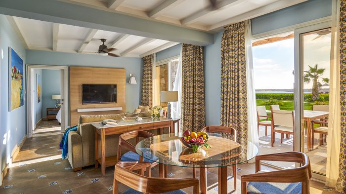 تم تصميم الأجنحة الجديدة المكونة من غرفة نوم واحدة أو غرفتي نوم بحيث توفر أقصى درجات الراحة والرفاهية، كما تضم غرفة جلوس وشرفة كبيرة مطلة على البحر. وتحتوي كل غرف النوم على حمام خاص بها، فضلاً عن مرافق الفندق الخاصة وإمكانية الوصول إلى الشاطئ الخاص.
