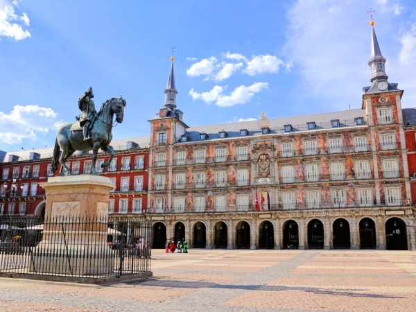 من بين المباني الضخمة في هذه الساحة: Pabellón (الجناح الملكي) وAyuntamiento (قاعة المدينة).