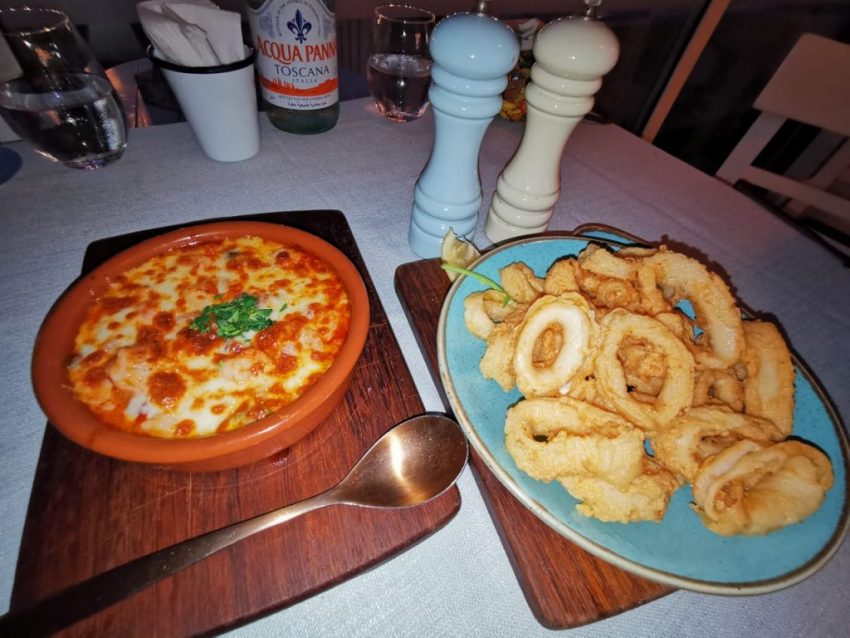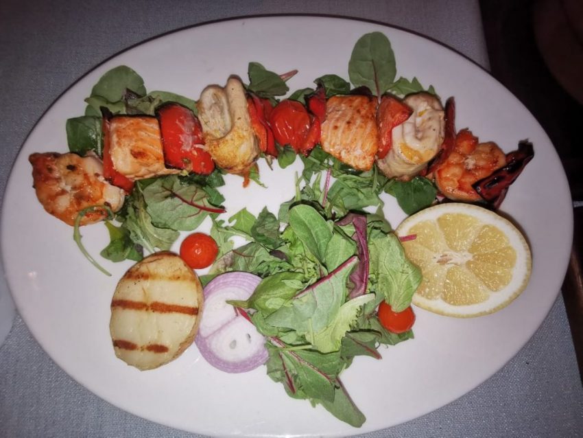 وتوفر القائمة تشكيلة من السلطات الطازجة والأطباق التقليدية الباردة والساخنة، وقد اخترنا من المقبلات الباردة كل من ورق العنب المطهو بالزيت على الطريقة التركية (ينصح بها) وطبق الأخطبوط والبابا غنوج، ومن المقبلات الساخنة الكالماري وطبق طاجن الشريم (ينصح به)، لقد كان مذاق هذا الأطباق رائعاً وكافياً لفتح الشهية للدخول بالاطباق الرئيسية، حيث اخترنا من ثلاجة الأسماك 3 أنواع منها وهي سمك القد، وسمك السلمون والجمبري، في حين طلبنا طهي بعضا منها كطاجن والاخر مشوياً، وعن الطعم فحدث بلا حرج عن مدى لذة هذه الاطباق.