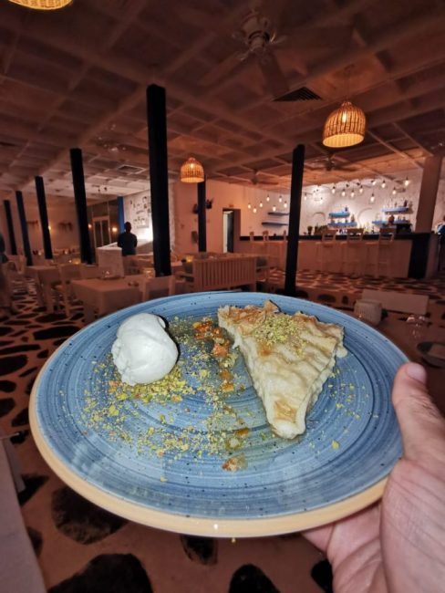 وليكون ختام هذه الأمسية رائعاً، اخترنا من الحلويات البقلاوة مع آيس كريم الفانيليا، والقطايف وهو عبارة عن بودنغ الخبز المخبوز بالفرن مع الكريمة التركية الطازجة والبندق، وننصحكم بتجربة الأثنين.