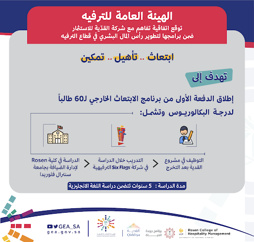 ضمن برنامجها للابتعاث الخارجي الذي أطلقته الأسبوع الماضي، وقعت الهيئة العامة للترفيه في مقرها بالرياض اليوم (الأحد) مذكرة تفاهم، حيث مثلّها سعادة الرئيس التنفيذي الأستاذ عمرو بن أحمد باناجه، وذلك مع شركة القدية للاستثمار التي مثلها سعادة الرئيس التنفيذي للشركة السيد مايكل رينينجر، والتي تستهدف التعاون في برامج مشتركة لتطوير رأس المال البشري، حيث ستكون باكورة التعاون في ابتعاث 60 طالباً وطالبة لدراسة البكالوريوس في كلية روزن لإدارة الضيافة بجامعة سنترال فلوريدا في الولايات المتحدة الأمريكية.