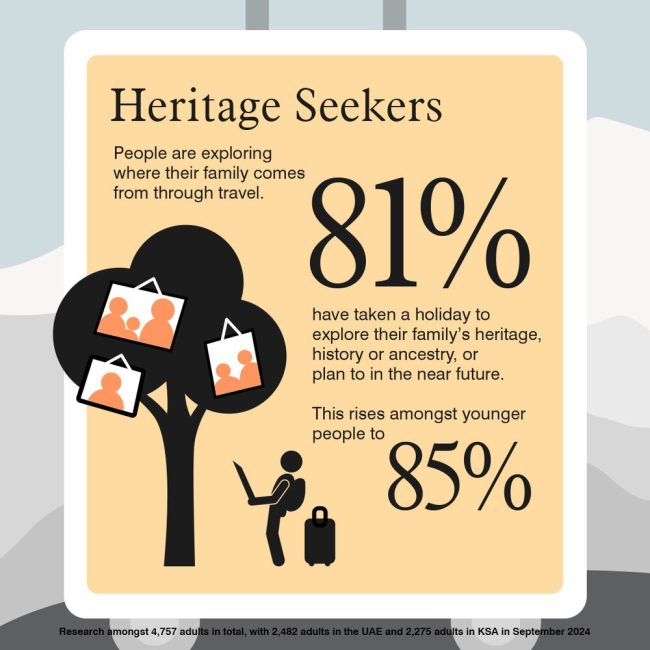 قال ما يقرب من نصف الأشخاص (49%) الذين شملهم الاستطلاع في الإمارات إنهم قاموا بالفعل بقضاء عطلة تراثية لاستكشاف تاريخ عائلاتهم، بينما قال 47% إنهم يخططون للقيام بذلك في عام 2025. وفي المجمل، ثمانية من كل 10 أشخاص في الإمارات العربية المتحدة والمملكة العربية السعودية قاموا أو يخططون للقيام بعطلة تراثية، وهي نسبة ترتفع بشكل ملحوظ بين أولئك الذين تتراوح أعمارهم بين 25 إلى 34 عامًا.