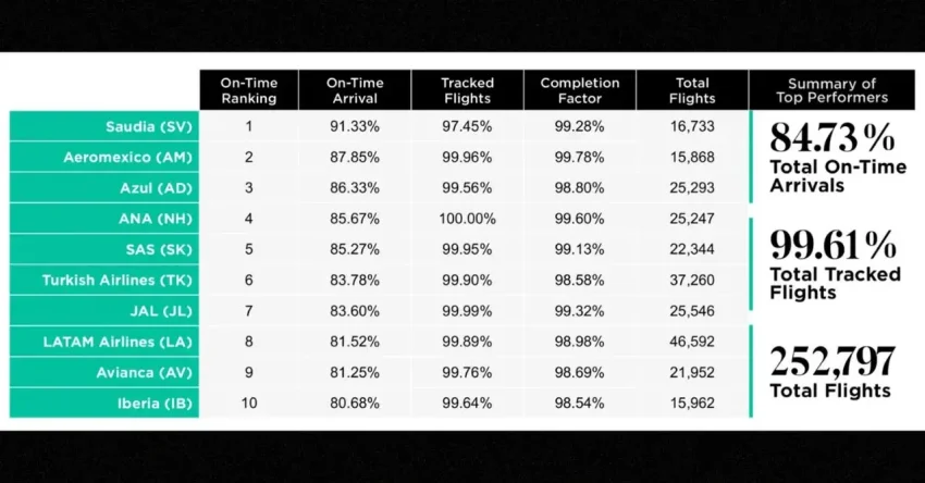 وأشار التقرير إلى أن الخطوط السعودية حققت المركز الأول من حيث أداء الوصول والمغادرة في ذلك الشهر، بنسبة وصول في الموعد المحدد بلغت 91.33%، ومغادرة في الموعد المحدد بنسبة 90.69%.