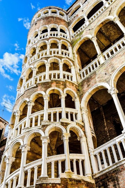 مختبئ في أزقة ضيّقة بالقرب من ريالتو، يبدو هذا السُلَّم الخارجي الحلزوني وكأنه خرج من إحدى القصص الخيالية. بُني في القرن الخامس عشر لعائلة كونتاريني، التي أرادت من خلاله إثارة إعجاب باقي طبقة النبلاء، واستخدمته كرمز للهيبة والمكانة. يجمع التصميم بين الطراز القوطي وعناصر من النهضة ولمسات بيزنطية فريدة. واسمه بوفولو يعني الحلزون باللغة الفينيسية؛ بسبب شكله الحلزوني المميز. وعندما تصعدين إلى أعلاه، ستستمتعين بإطلالة ساحرة على أسطح فينيسيا، وبرج سان ماركو الشهير.