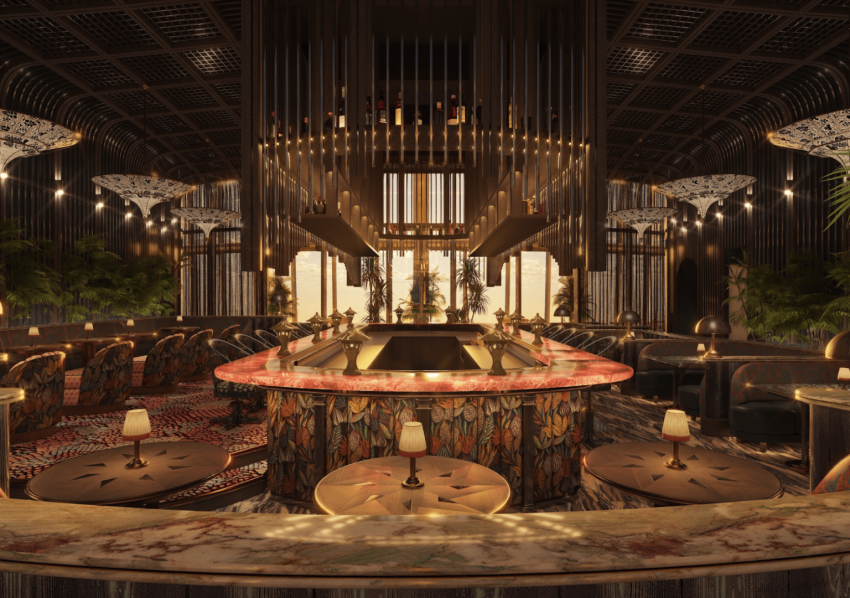 من هنا تبدأ الحكاية. تصميمات داخلية آسرة تمتد من الأرضية حتى السقف بإطلالات بانورامية على “مرسى دبي” و”نخلة جميرا”، وأجواء تمزج بين الأساطير الشرقية والحداثة العصرية.