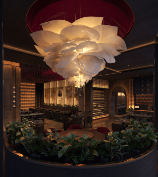 تبدأ الرحلة من بار منحوت بأناقة، ثم ممر خافت الضوء يقود إلى صالة طعام تتلألأ بثريا زهرية ونسيج من الأقمشة المنسدلة،