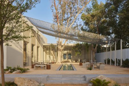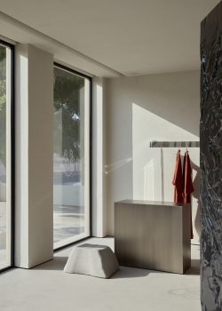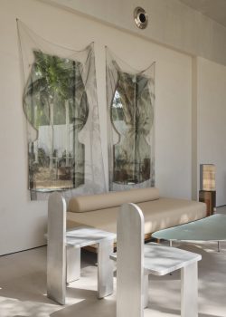وقد تبنى التصميم سمات الفيلا المميزة لسبعينيات القرن الماضي – أسقفها المنخفضة، وتصميمها المجزأ، وبنيتها غير المنتظمة – لتتحول إلى لوحة فنية للتجريب. الجدران المغطاة بمشمع، والمقطوعة بأشكال غير منتظمة تشبه الورق، تُضفي دفئاً وجودة راقية غير مكتملة، بينما تُضفي عناصر مستدامة مثل الراتنج ثلاثي الأشكال والفولاذ المقاوم للصدأ وضوحاً عصرياً. أكثر من مجرد خلفية، يتحول المكان إلى بيئة مفتوحة أشبه بمعرض فني، حيث تتكشف الضيافة والحرفية والتبادل الثقافي بسهولة.