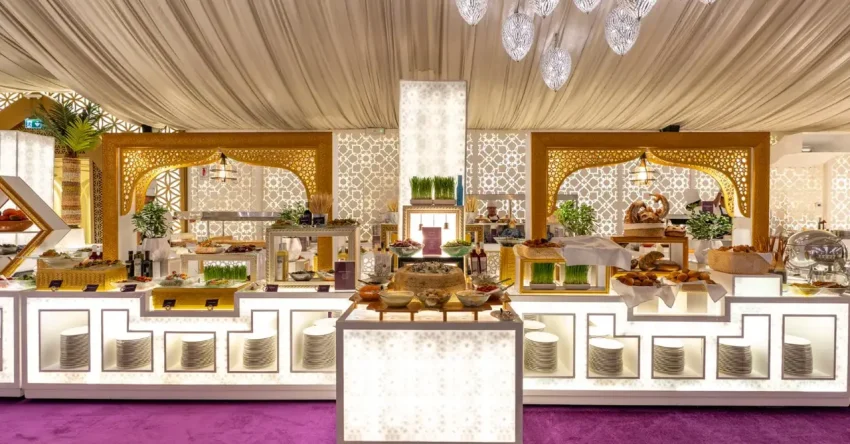يبدأ الإفطار عند غروب الشمس بتقديم التمر والماء، يليه بوفيه فاخر من إعداد الشيف علي البرجي، المدير التنفيذي للمطبخ في أتلانتس دبي. ويضم البوفيه أطباقاً كلاسيكية وأخرى مميزة، منها الكبة الساجية المشوية على الفحم، والمحضرة من اللحم المفروم المتبل والبرغل، وباييلا المأكولات البحرية، المطبوخة مع أرز الزعفران ومرق المأكولات البحرية. وسيُصاحب تناول الطعام موسيقى عربية تقليدية حية طوال الأمسية.