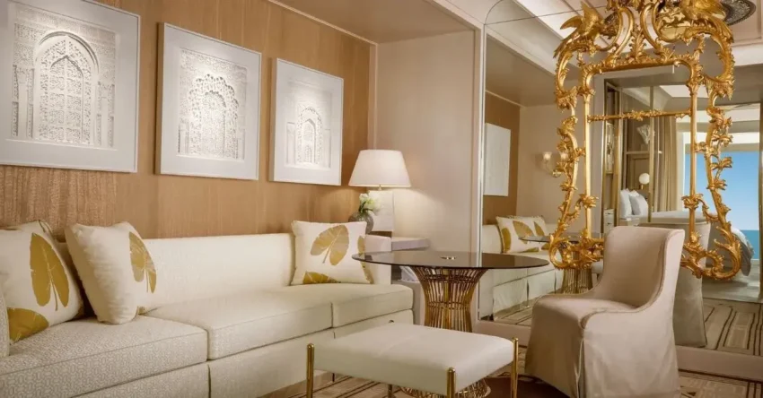 ستستمد التصميمات الداخلية من تصميم أنوسكا هيمبل وبينتو ديزاين إلهامها من الخليج العربي المحيط، مما يوفر لوحة هادئة من البلاتين والياقوت والذهب ورذاذ البحر.
