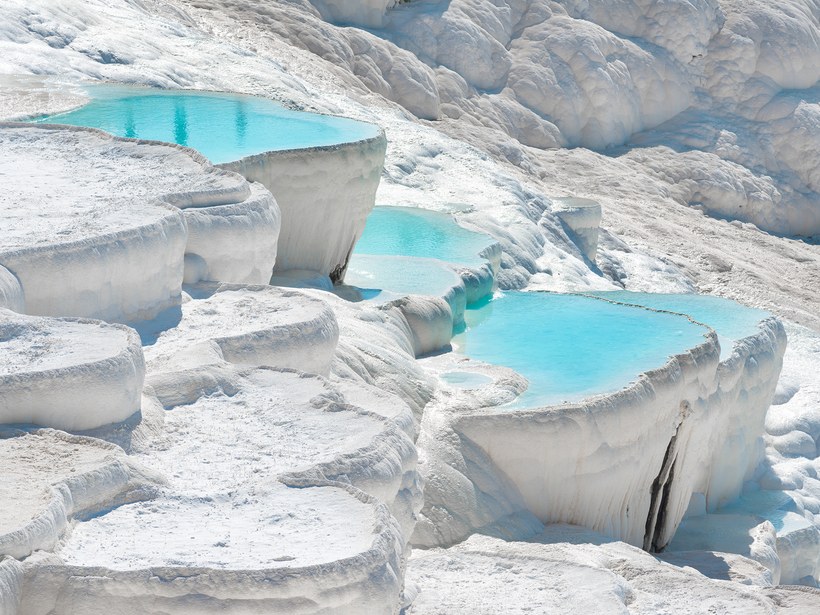 تعتبر المسابح الـ 17 في Pamukkale (“قلعة القطن” باللغة التركية) جميلة مثل الينابيع الساخنة. تعلو أكوام الترافرتين الأبيض (وهو نوع من الحجر الجيري) مدينة دينيزلي ، وتصل درجة حرارة المياه (94 درجة) فهرنهايت التي لا تزال تعكس السماء بحر ايجه. تعد المسابح محظورة على الأشخاص ، هذا موقع اليونسكو للتراث العالمي لديه أكثر الينابيع الساخنة الطبيعية الفريدة في العالم. المياه الزرقاء ضد الصخور البيضاء تجعل الينابيع الساخنة تبدو باردة كالثلج.