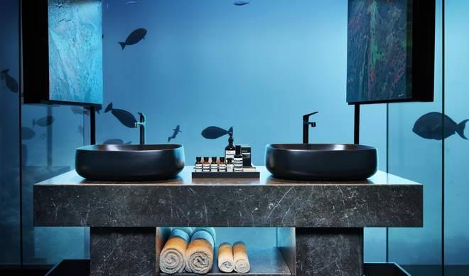 ويحتوي المكان على حيطان زجاجية مضادة لاختراق الأسماك، بالإضافة إلى قدرة كبيرة على تحمل ضغط الماء، حيث يكون الاستيقاظ تحت الماء في الليل، في ظل عتمة المحيط والظلام، ما يجعل السمك غير مرئي، ولكن ليس صامتًا حيث يمكنك سماع أصواته، فيما يكون الصباح رائعاً، حيث تختلط أشعة الشمس بمياه المحيط الزرقاء تحت الزجاج البانورامي.